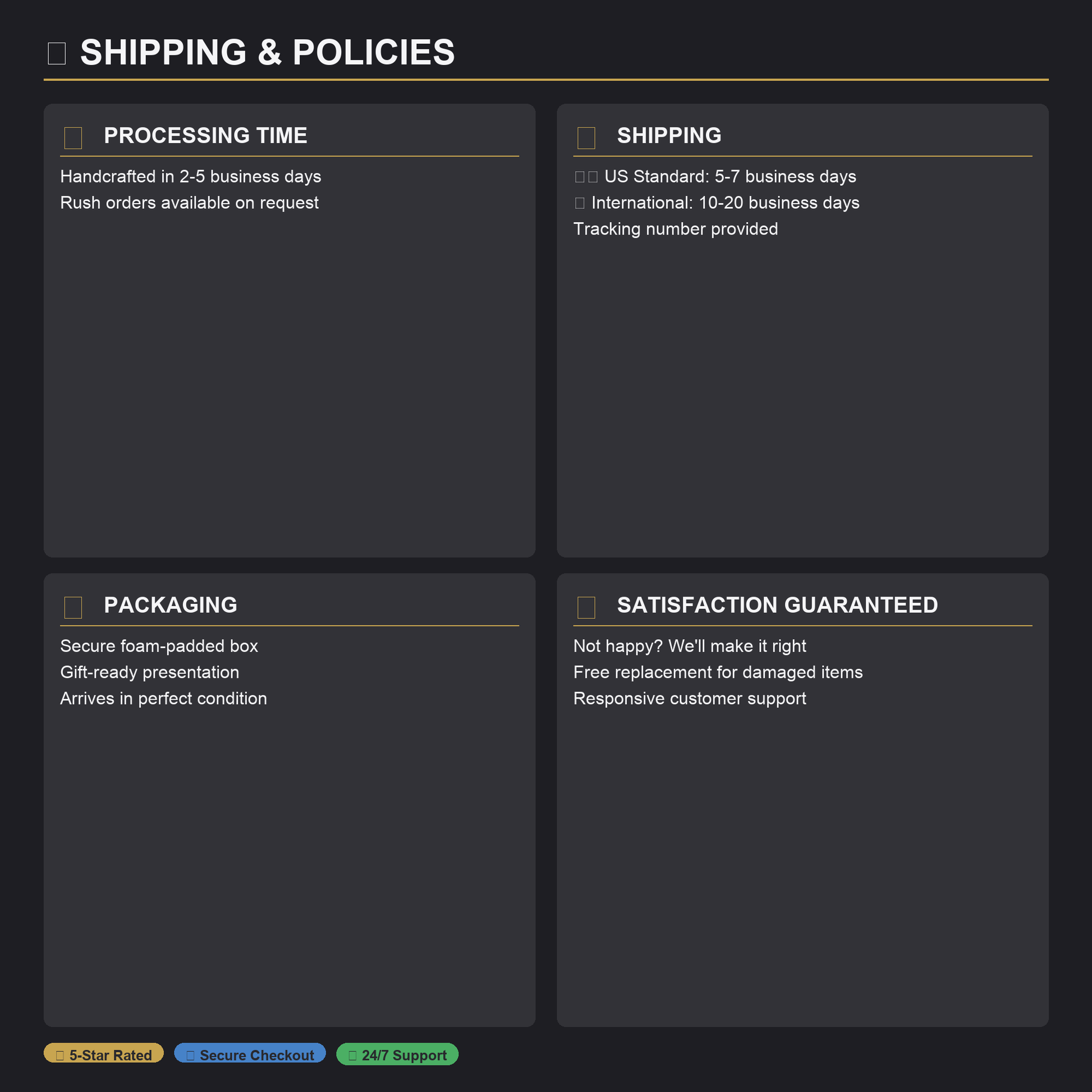 - Production time: All orders are processed within 2 - 5 business days.
